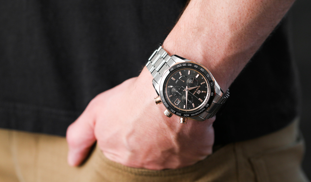 Around back, an exhibition case back shows off the stunning 9R86 caliber, a Spring Drive chronograph with a GMT. It features a vertical clutch and column wheel design, which allows for high precision and great tactility when engaging the chronograph function. The movement has an accuracy rating of +-15 seconds per month (which extends to the elapsed time), making it the world’s most accurate spring-driven chronograph. 9R86 is made of more than 400 parts, and each caliber is hand assembled by the skilled craftsmen and women of the Shinshu Watch Studio.