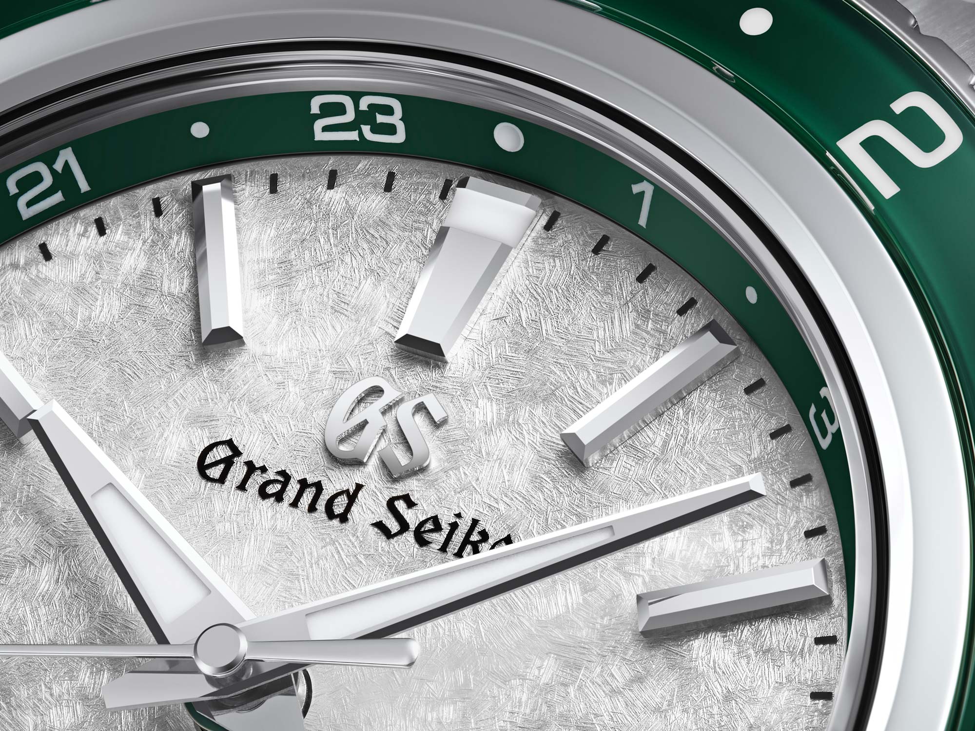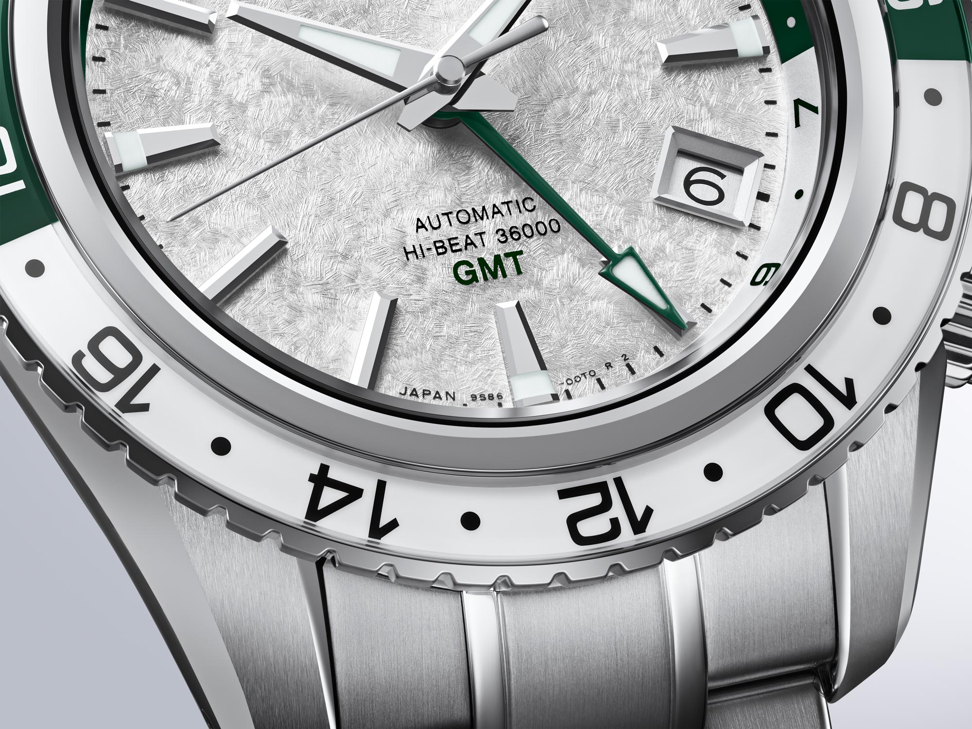 The magnificent mountain scenery of the remaining snow juxtaposed with greenery on a summer mountain is reproduced in the contrast of the snow-white colour of the textured dial alongside the green of the rotating bezel and its ring of sapphire glass.