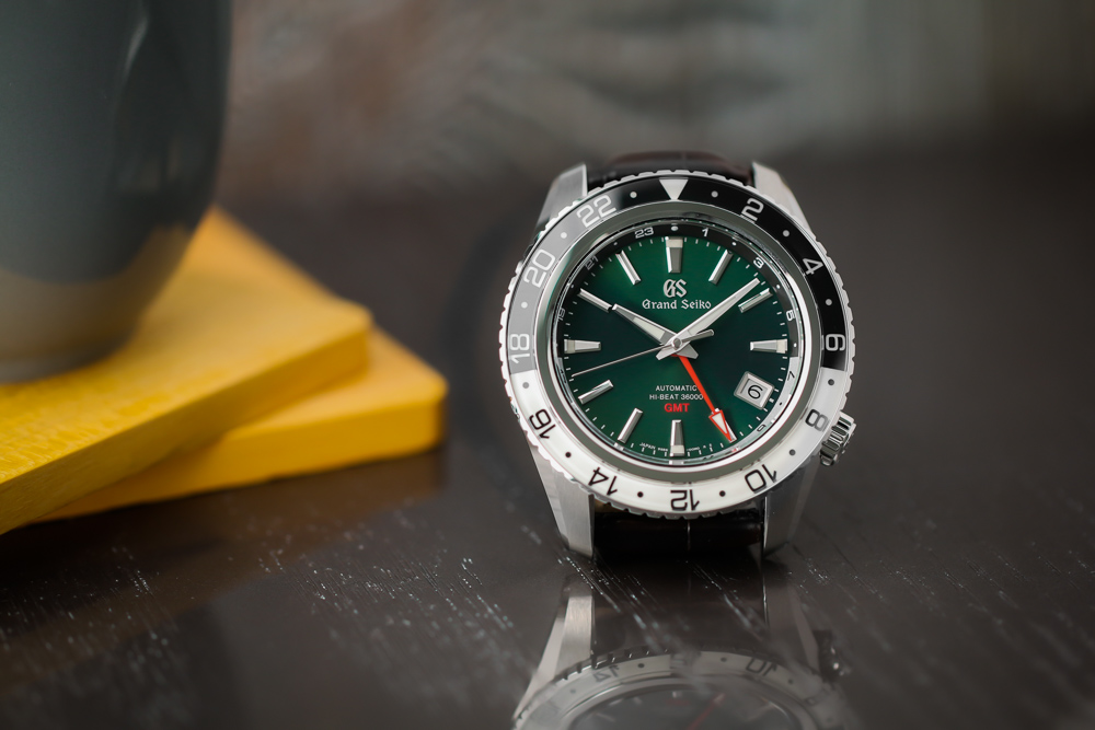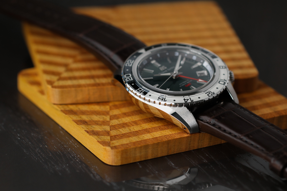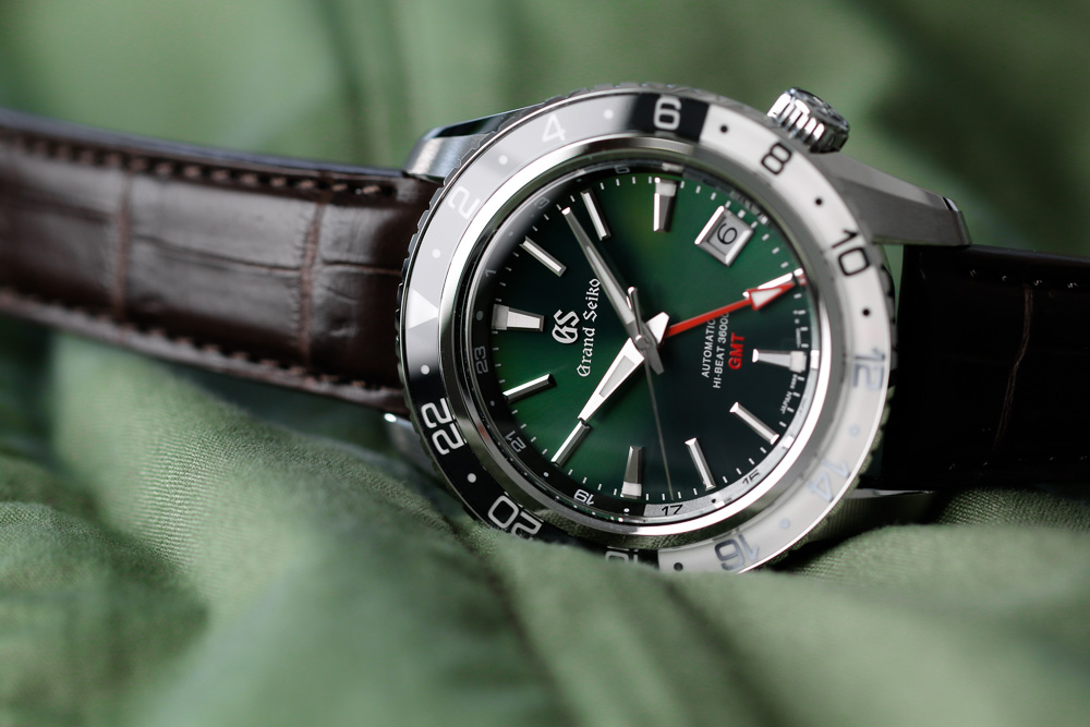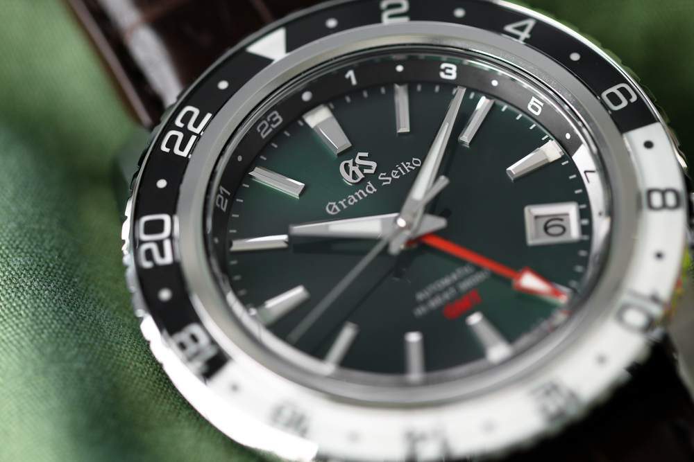 The dial is “Vintage Green” with a sun-ray pattern. Depending on how the light hits the dial, the green can look darker or lighter. The indexes are bold, sculptural, and beautifully finished. As is the case with all Grand Seiko indexes, these make full use of the interplay of light and shadow, giving them a striking appearance every time you look down at the watch. They feature ample Lumibrite paint at the cardinal points, lending to excellent nighttime visibility. The top surface of the hour and minute hands feature hairline finishing, which keeps them from getting lost against the darker colored dial. Accenting the green is a splash of red found on the “GMT’ text on the dial and on the GMT arrow hand, also finished with luminous paint.
