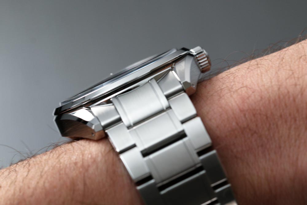 The flat, polished mirror surfaces of the case create distortion-free reflections and allow for deep blacks and bright whites to emerge, while the use of a hairline finish brings out the many subtle shades of light and dark between these two ends of the spectrum. To give the watches a more versatile look, Sakai intentionally reduced the use of mirror finishing, and instead increased the use of hairline finishing throughout. The heavier use of hairline surfaces, by contrast, enhance the mirror surfaces between them.
